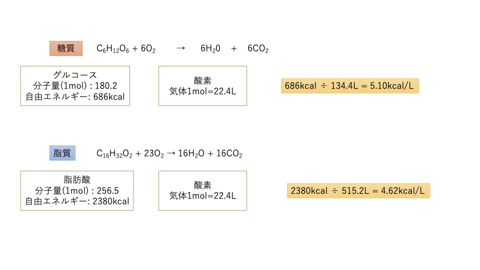 糖質で酸素1Lあたり5.10kcalのエネルギー消費