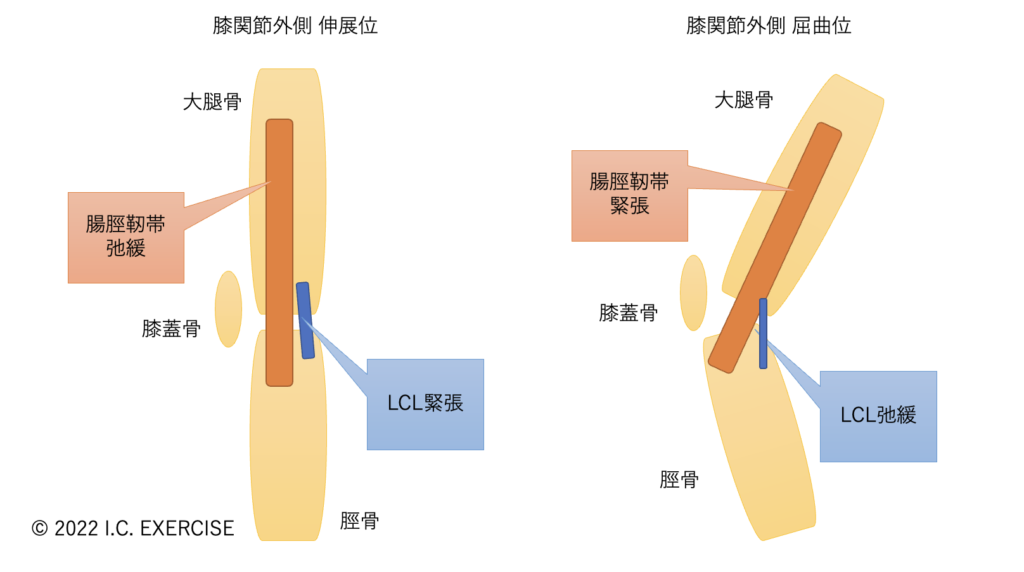 膝関節伸展位の状態ではLCLが緊張しており、腸脛靭帯が弛緩している状態です。