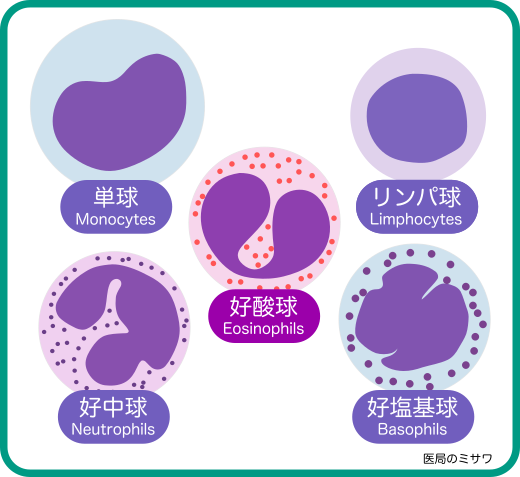 好中球(Nut)・好酸球(Eo)・好塩基球(Ba)・単球(Mo)・リンパ球(Ly)