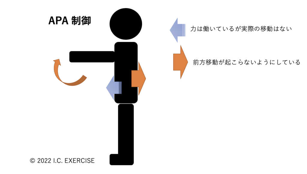 実は、腕をあげるときには腕をあげる前にFeedforwardシステムが働き、少し体幹部を後ろにしてくれています。これをAPA(予測的姿勢制御機構)と呼び、安定して四肢を動かすことを可能にしてくれています。