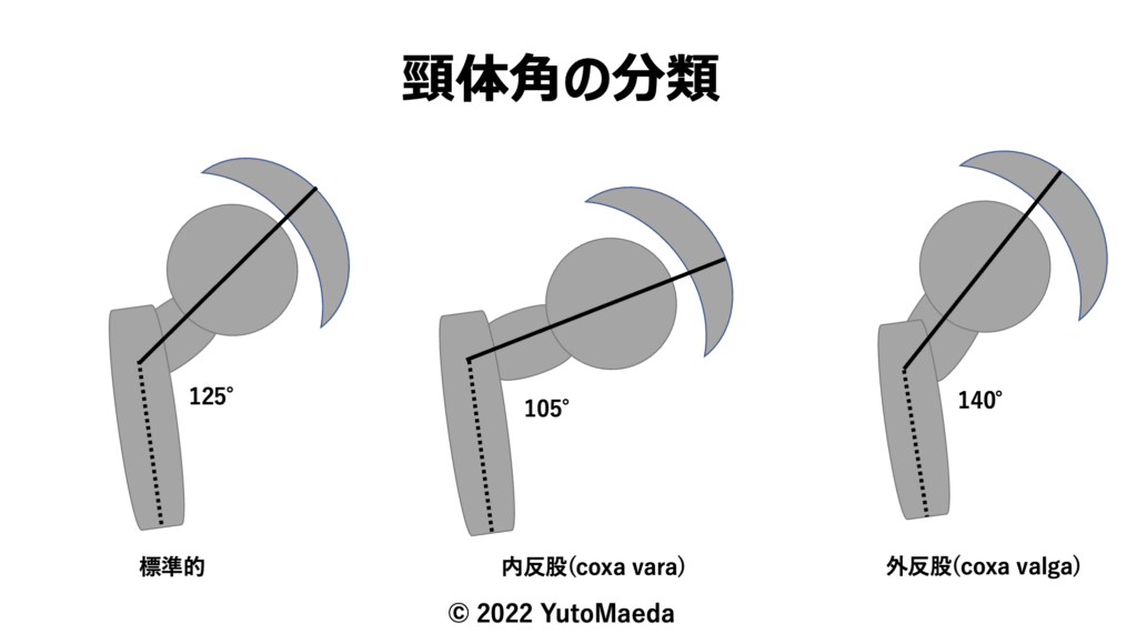 出生時ではこの角度の平均は約165-170°ですが、主に歩行中の筋活動や荷重が大腿骨頸部にかかるとこの角度が減少していきます。その後頸体角は成人の標準値である125°に達するまで減少を続けます。