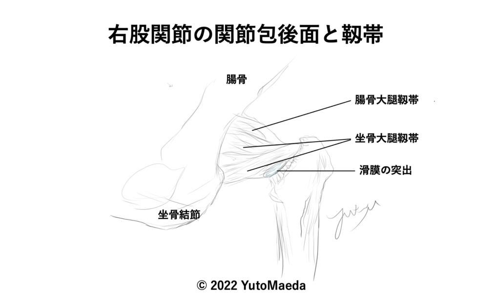 そして滑膜の外側は腸骨大腿靱帯(Y靭帯)・恥骨大腿靱帯・坐骨大腿靱帯の3つの靱帯が補強しています。