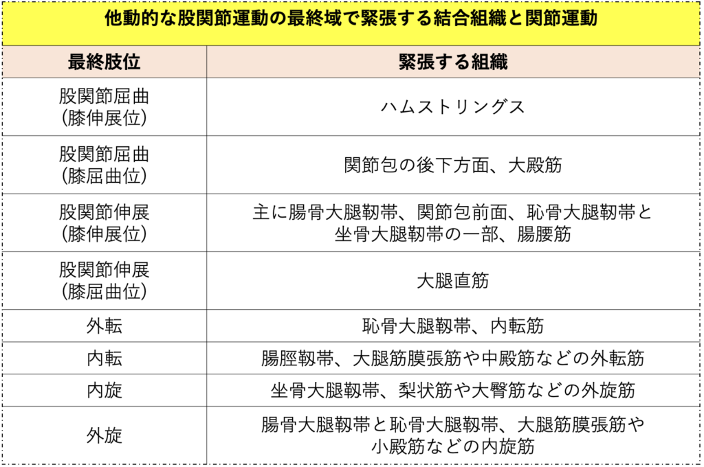 これらの靱帯や周囲筋がどのポジションの最終制限要因になるかをNeumann, D. A. (2012). 筋骨格系のキネシオロジー2を参考に以下の表に表しました。
