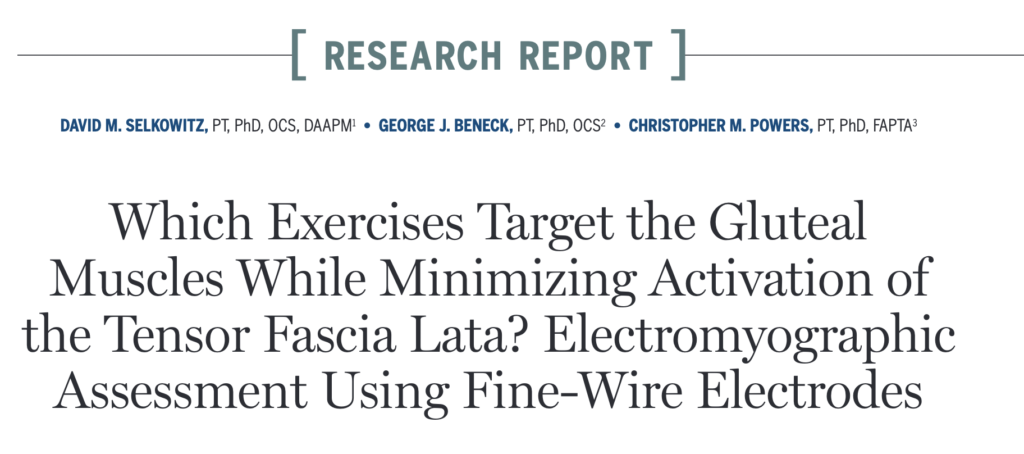 - Selkowitz DM, Beneck GJ, Powers CM. Which exercises target the gluteal muscles while minimizing activation of the tensor fascia lata? Electromyographic assessment using fine-wire electrodes. J Orthop Sports Phys Ther. 2013 Feb;43(2):54-64. doi: 10.2519/jospt.2013.4116. Epub 2012 Nov 16. PMID: 23160432.