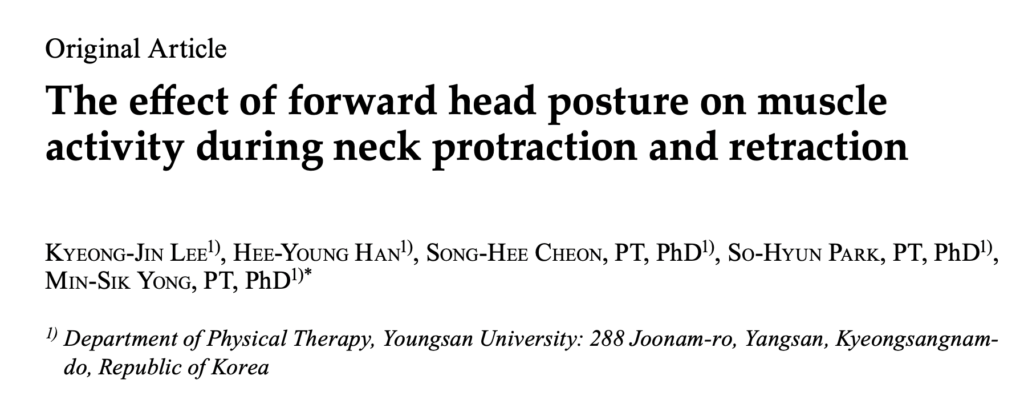 Lee KJ, Han HY, Cheon SH, Park SH, Yong MS. The effect of forward head posture on muscle activity during neck protraction and retraction. J Phys Ther Sci. 2015 Mar;27(3):977-9. doi: 10.1589/jpts.27.977. Epub 2015 Mar 31. PMID: 25931773; PMCID: PMC4395757.