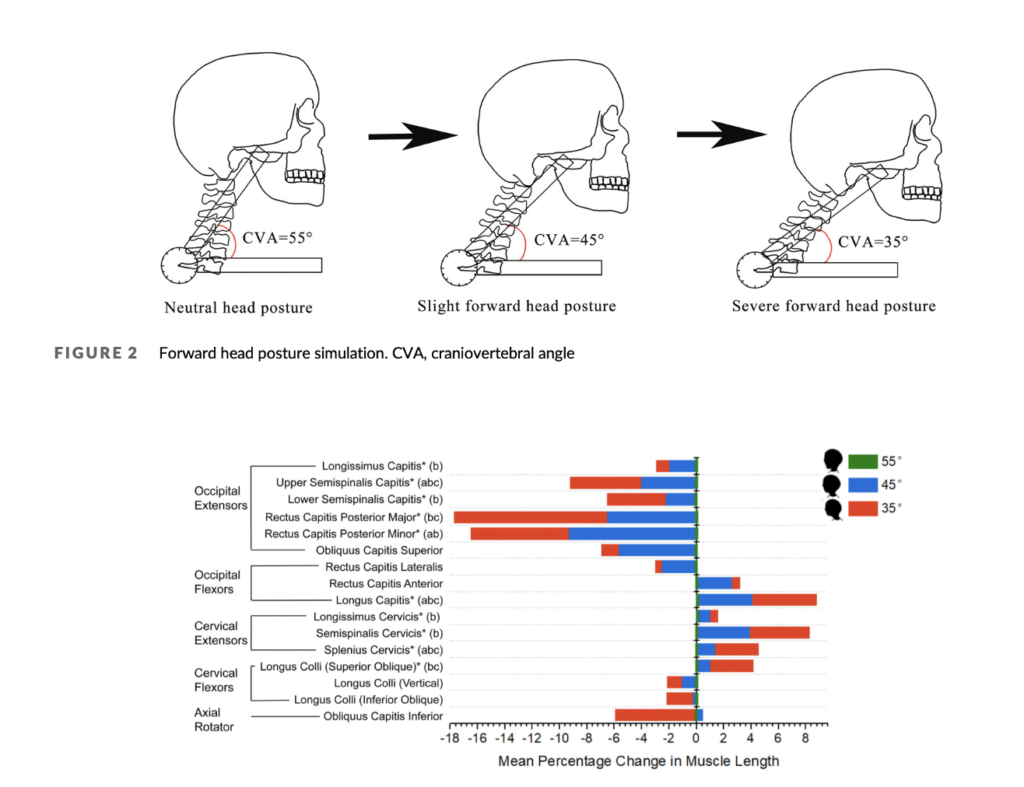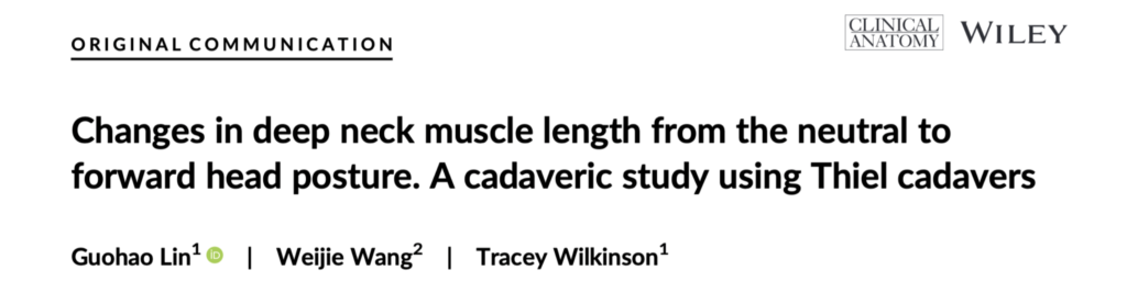 Lin G, Wang W, Wilkinson T. Changes in deep neck muscle length from the neutral to forward head posture. A cadaveric study using Thiel cadavers. Clin Anat. 2022 Apr;35(3):332-339. doi: 10.1002/ca.23834. Epub 2022 Jan 25. PMID: 35038194.
